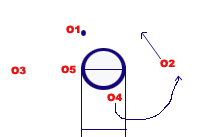 The basic pattern continues in figure 2-4. O1 must follow the rule of not standing still and exchanges with O3. O2 moves forward to meet a possible pass from O4 while O5 crosses over in order to follow the rule of staying even with the ball. These movements are used primarily to make the defense have to constantly adjust to the changing of the location of the ball. This also helps to free the forwards for a penetrating pass to start the offense